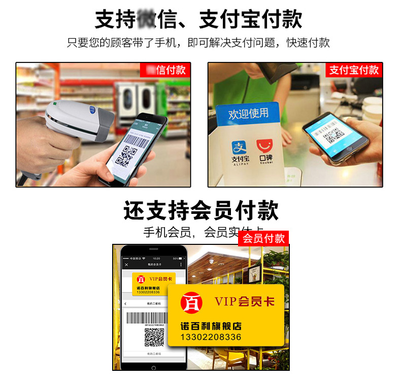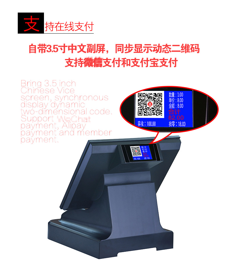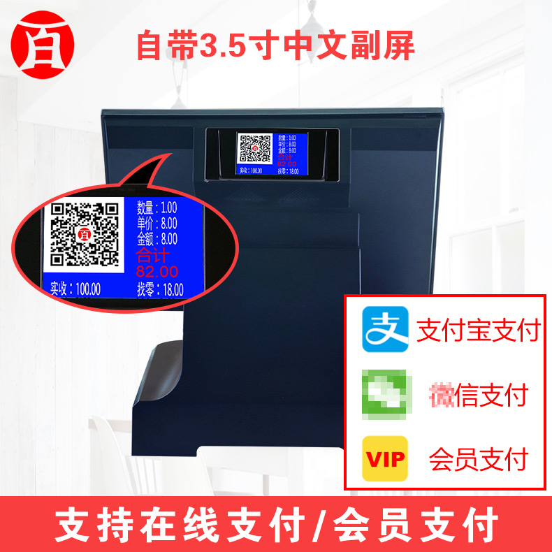 自带3.5寸中文副屏,同步显示动态二维码,支持微信支付和支付宝支付